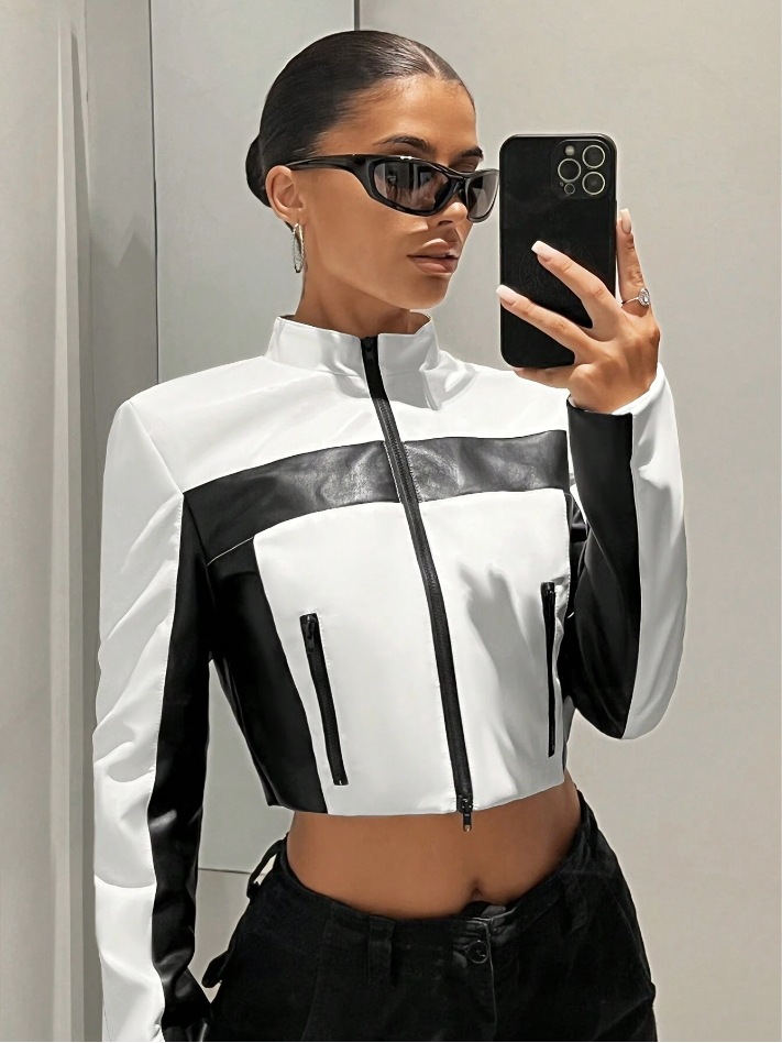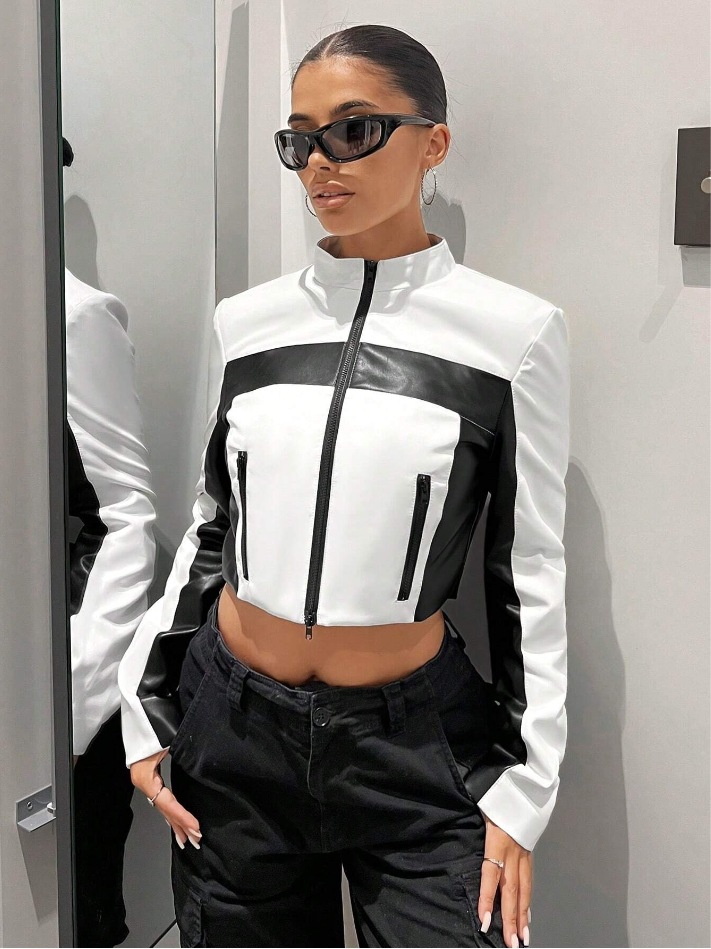Black And White Contrast Color Leather Coat Women's Zipper Short Slim Jacket